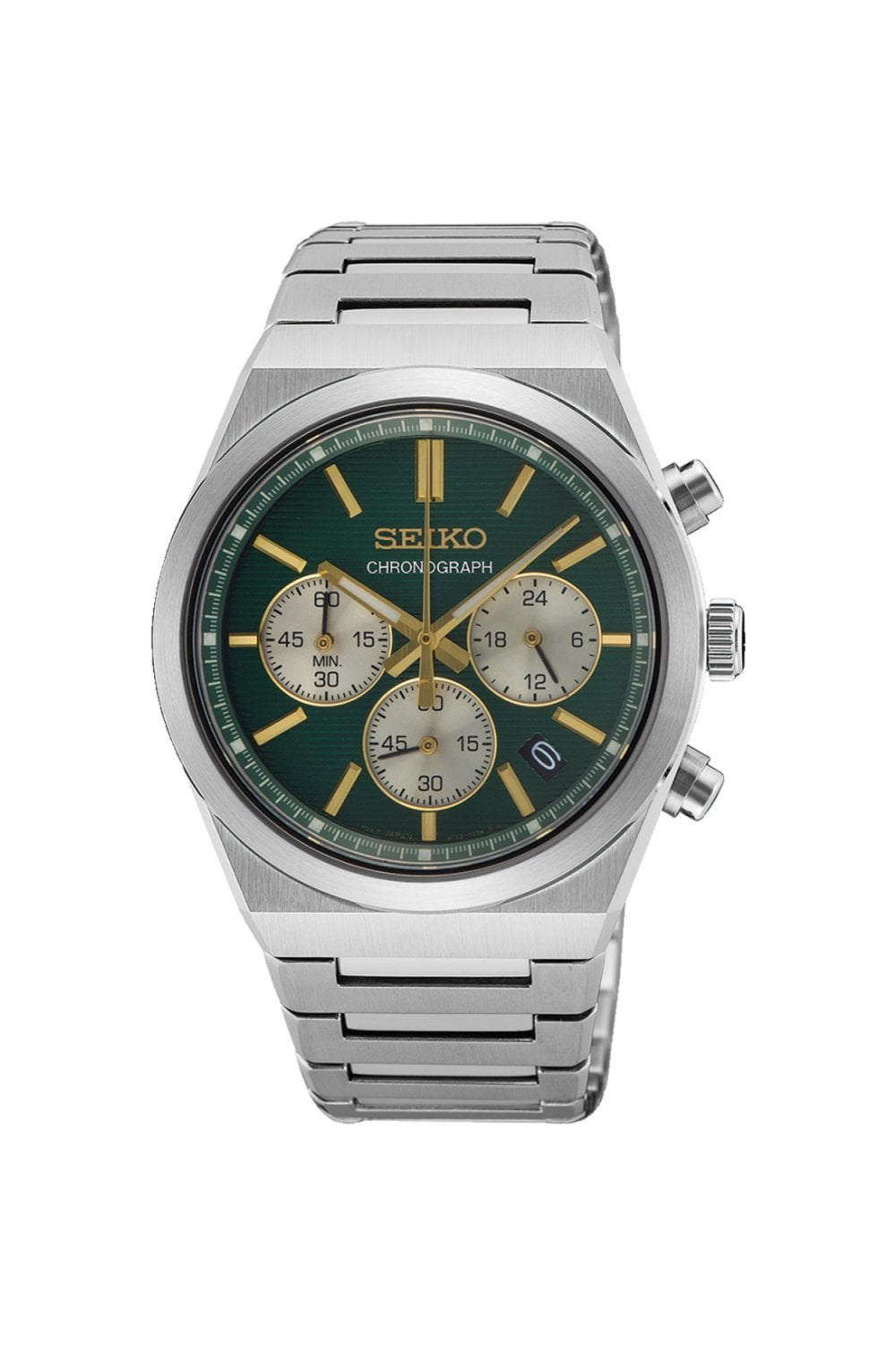 The Seiko SSB461P1 is a sleek and sporty chronograph from the Seiko SPORT collection. It features a 40mm stainless steel case with a matching bracelet, a sapphire crystal, and a striking green dial with three sub-dials for its chronograph functions.