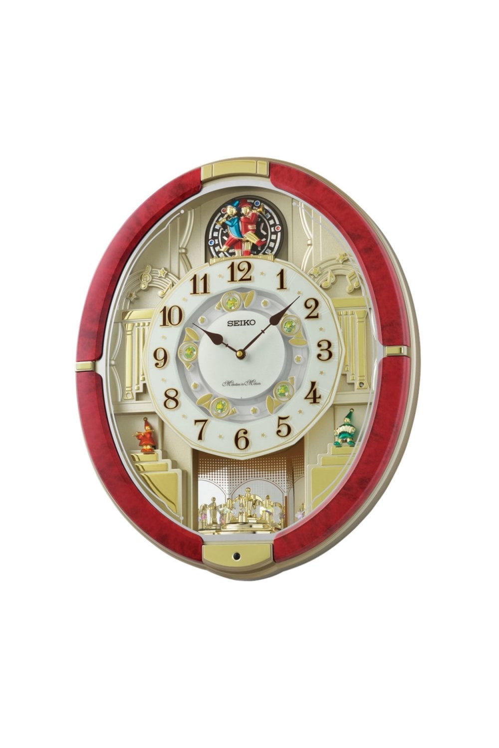 The Seiko QXM612R is a Melodies in Motion wall clock that blends classic charm with musical flair. It features a red marble and white design and plays 30 high-fidelity melodies, including classical pieces like The Four Seasons, Ode to Joy, and Eine Kleine Nachtmusik, as well as festive tunes like Jingle Bells and Silent Night.