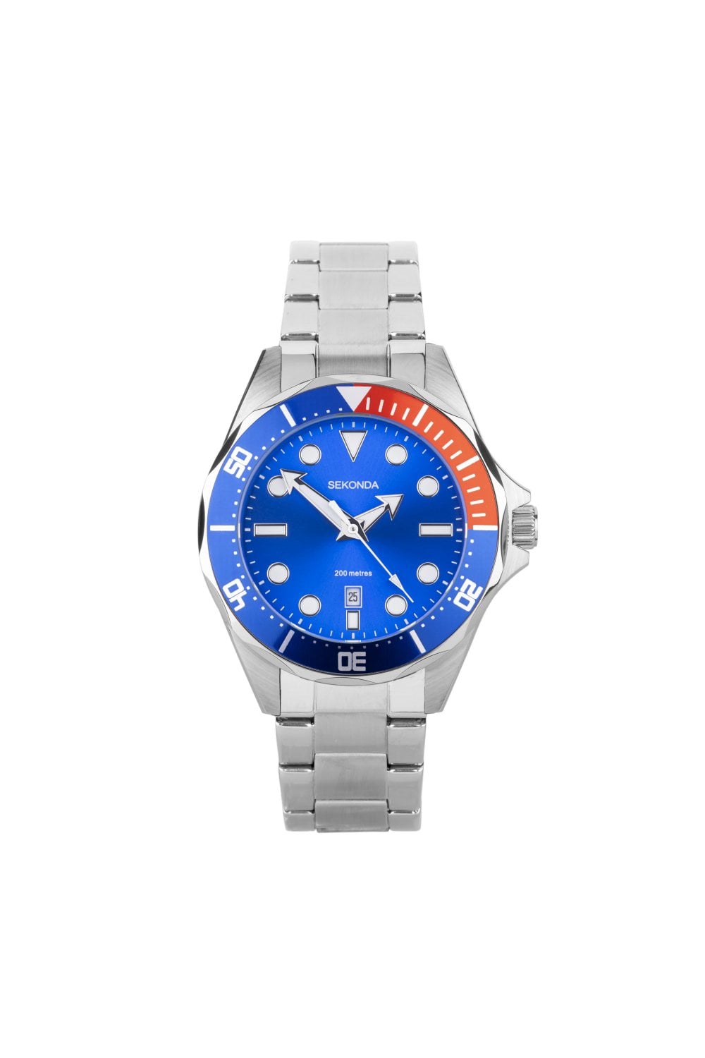 Add a new lease of life to your wrist with this men's Divers style watch from Sekonda. Featuring a stunning analogue blue face with a blue and red pepsi dial bezel, in a 42mm diameter 10mm thick case. It has all the features you've come to expect from Sekonda, including Crown Protector, Date window, Mineral Glass, Luminous Hands and Hour Batons, Push/Pull Crown and Water-Resistant. With a fully adjustable stainless steel bracelet. This watch is water resistant up to 200 metres, perfect for any water related adventures such as swimming. It also comes in it's own Sekonda Gift Box making it the perfect present. All this with a 2 Year Manufacturers (International) warranty for extra peace of mind. Explore the full range of Rubicon Exclusive Sekonda Sports and Divers watches, to find the watch that suits your lifestyle needs.