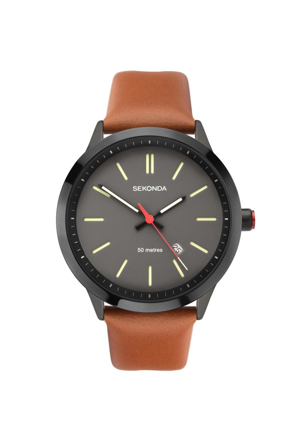 This 43mm casual watch features a grey dial with minimalist batons, red-tipped second hand, and a date window. The black case and brown leather strap deliver understated style with 50m water resistance for daily wear.