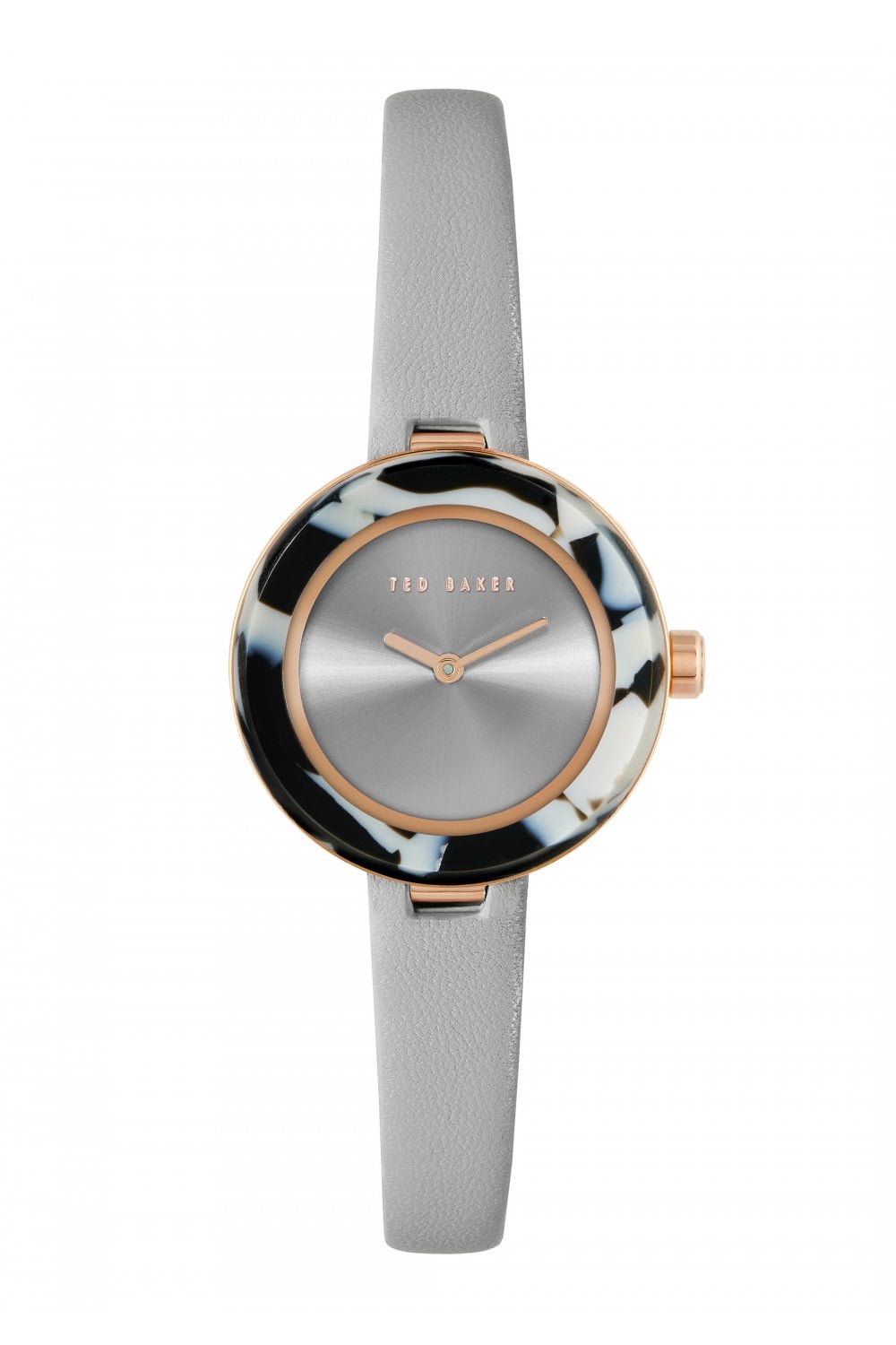 The BKPLEF110 is a stylish women's watch from Ted Baker. It features a 28mm rose gold-tone stainless steel case with a grey leather strap and a grey dial. The watch operates on a quartz analog movement and is water-resistant up to 50 meters.