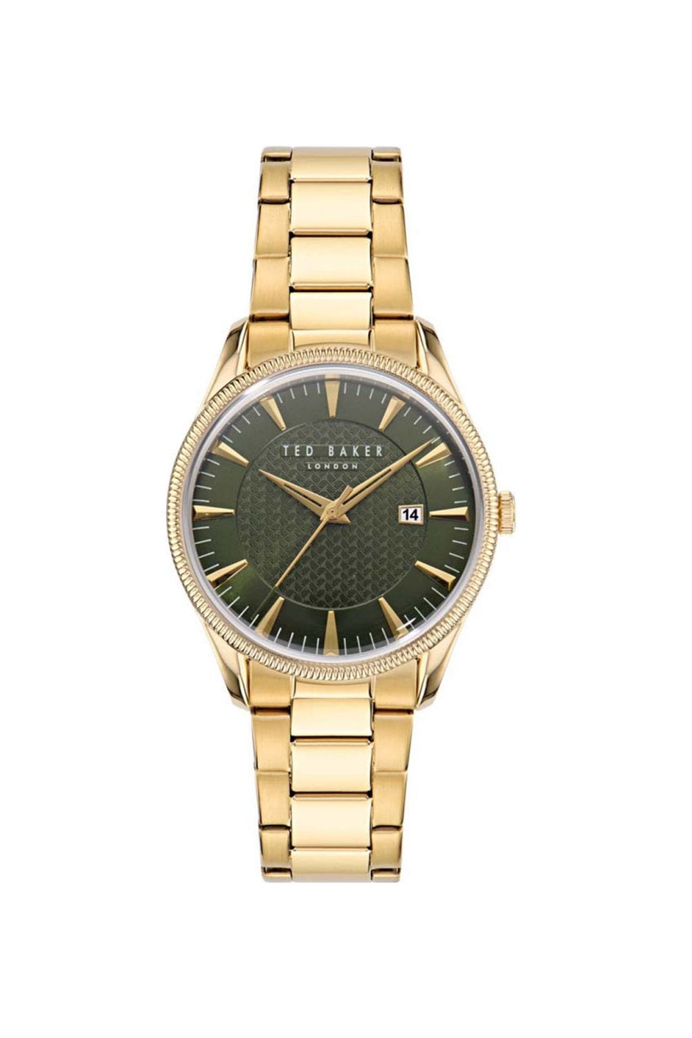 The BKPLTS403 is the Ted Baker Leytonn 40mm Quartz Watch. It features a green dial with a gold-tone stainless steel strap.
