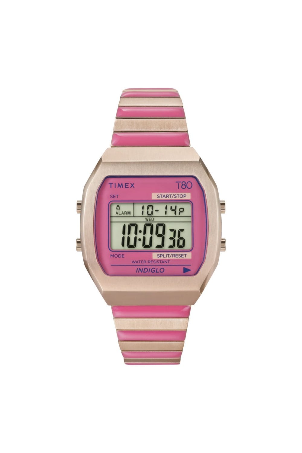 Dive into a world of color and luxe. Our Timex T80 transports you to sun-soaked days in faraway destinations with a lens and stainless-steel Perfect Fit expansion band in a captivating colorway that brightens up all your vacation looks. Other details include all you’d expect from our T80 – a chronograph function, daily alarm, INDIGLO backlight, and date display.