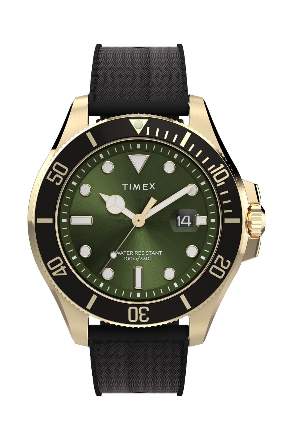 The Harborside Coast has an elevated look meticulously designed with nautical influence at the helm. Featuring a 43mm, gold-tone case with 100 meters of water resistance, this diver-inspired, polished-yet-rugged watch stands out on the wrist with a silicone strap. Complete with an anodized aluminium inlay on a rotating bezel, plus luminescent paint on the markers and hands, the Harborside Coast is ready to set sail.