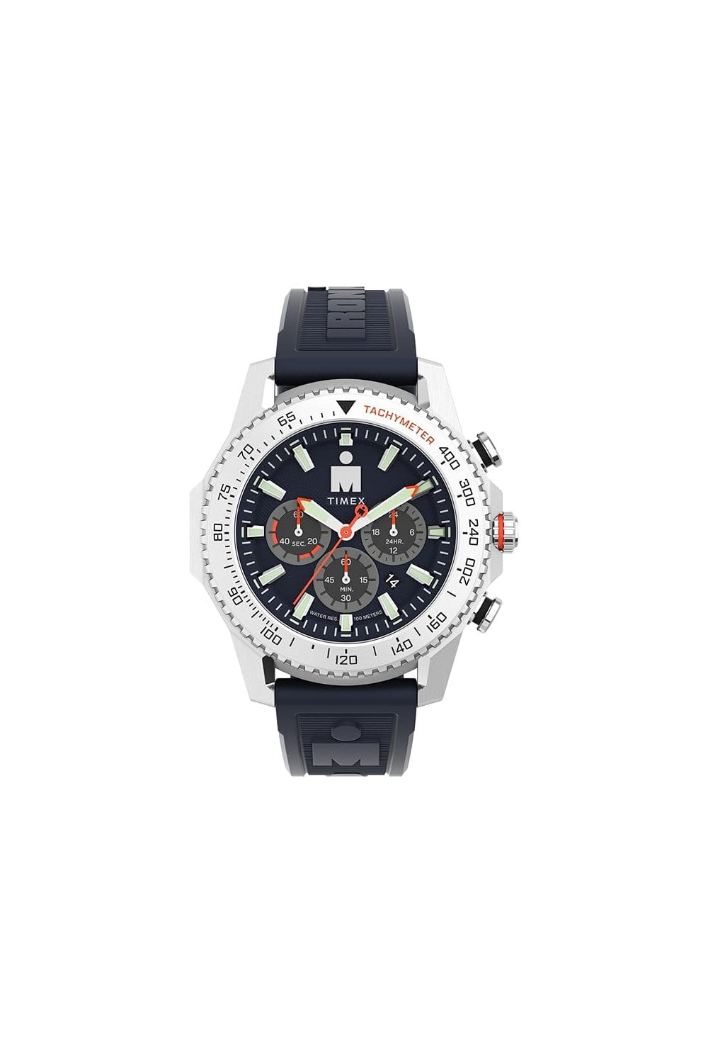 With its substantial 48mm stainless-steel case and cut-out detailing on its lugs, our TIMEX IRONMAN Adrenaline Chronograph brings bold style to our TIMEX IRONMAN line. It’s built with a chronograph movement for measuring elapsed time and recessed sub-dials that bring dimension to the dial. A date window between the 4 and 5-o'clock markers furthers the dial’s intricacy, while the iconic TIMEX IRONMAN logo appears on the dial, crown, and embossed rubber strap. Luminescent hands make it easy to tell time even in low-light conditions, while 100m of water resistance ensures that this watch can handle any weather.