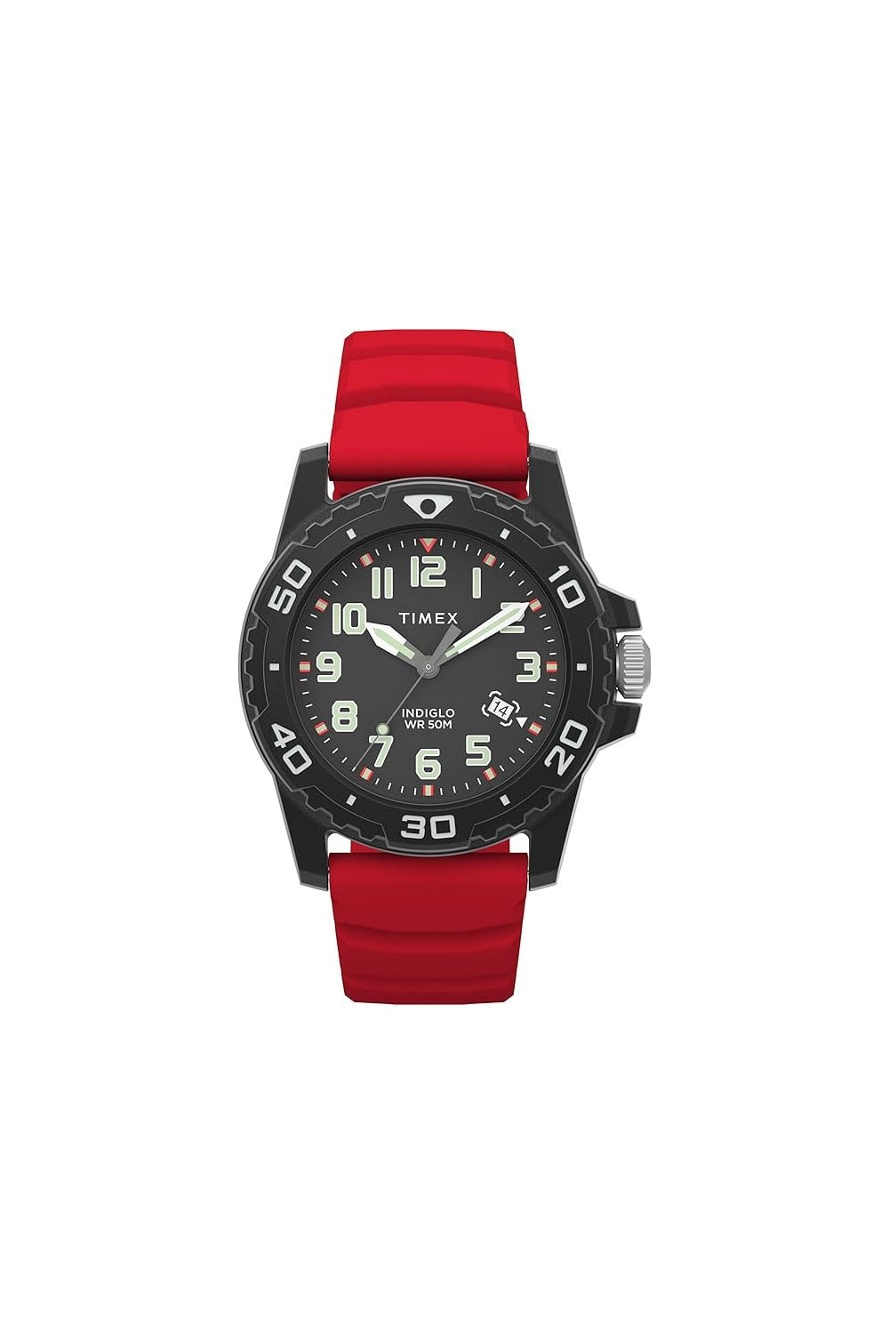 Our Timex Diver Inspired is crafted around a rugged 42mm resin case, capturing the tactical aesthetic of a true diver watch. Its dial features a date window, luminescent hands, and easily legible hour markers presented in bold, luminescent Arabic numerals. With a comfortable silicone rubber strap in red; our revolutionary INDIGLO backlight; and 50m water resistance, it’s the perfect companion for your next outdoor adventure.