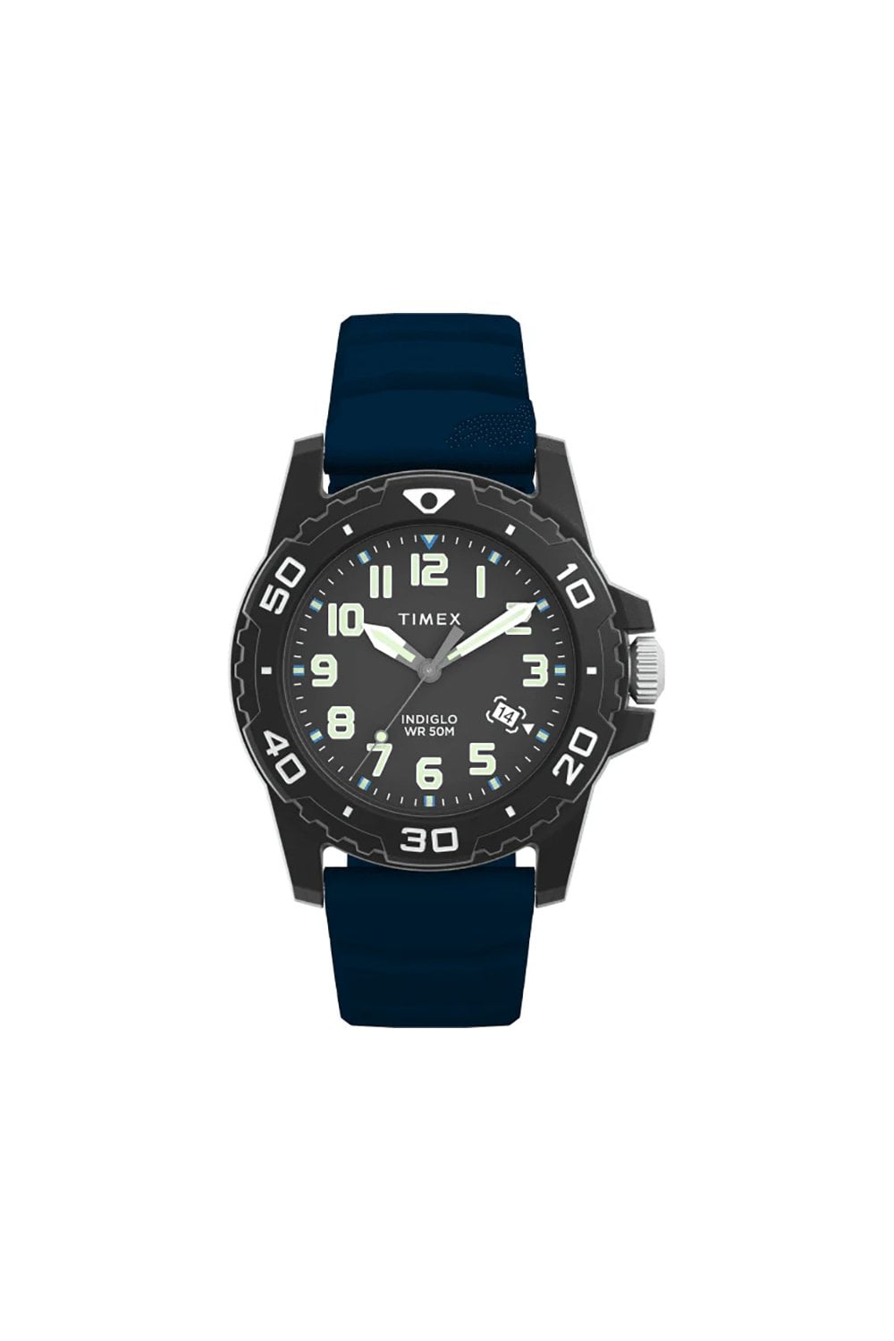 Our Timex Diver Inspired is crafted around a rugged 44mm resin case, capturing the tactical aesthetic of a true diver watch. Its dial features a date window, luminescent hands, and easily legible hour markers presented in bold, luminescent Arabic numerals. With a comfortable silicone rubber strap in blue; our revolutionary INDIGLO backlight; and 50m water resistance, it’s the perfect companion for your next outdoor adventure.