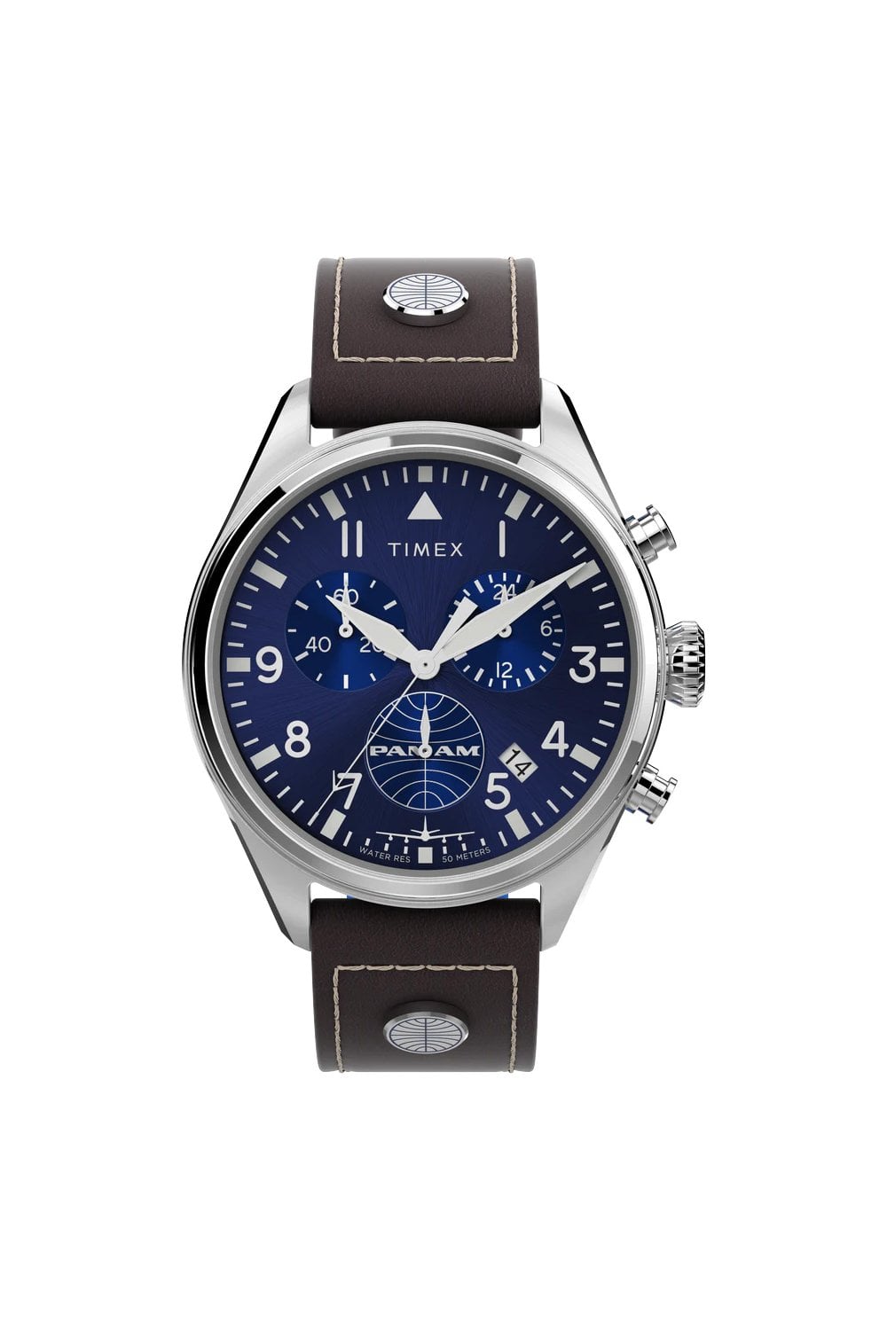 A signature Timex collection takes flight. In proud partnership with one of the world’s most iconic global airlines, the Timex x Pan Am Waterbury celebrates the industry leader’s rich heritage of aviation. Featuring the 42mm stainless-steel case construction of our classic Waterbury, we’ve channeled the precision, ergonomics, and unencumbered legibility all but required by early aviators as they took to the skies, incorporating bold Arabic indices on its uncomplicated navy-blue dial. With a chronograph movement and brown leather strap featuring Pan Am’s unmistakable “globe” accent plates, the result is a nostalgic tool watch that captures the spirit of American ingenuity.