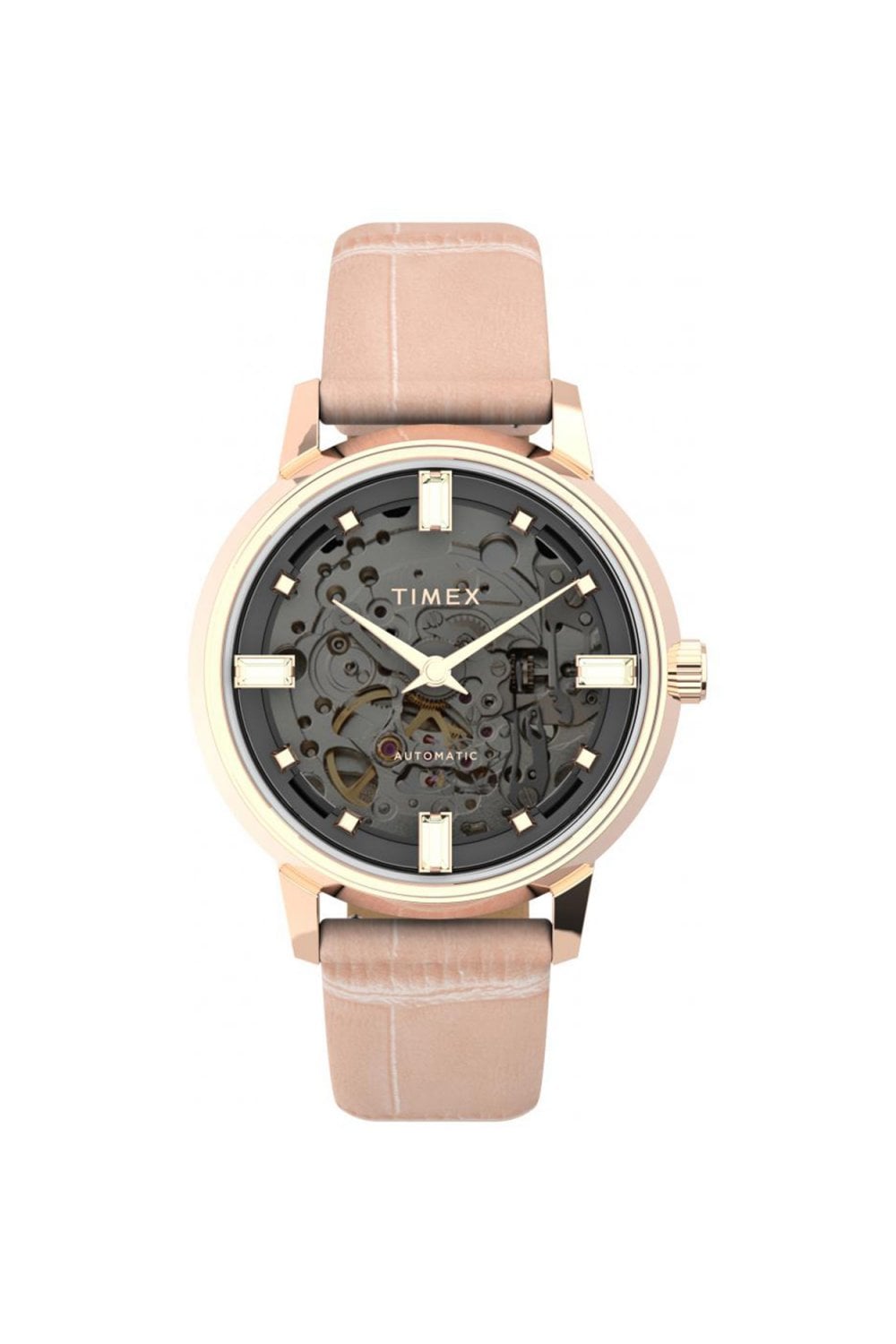 Reveal the beauty of timekeeping with the Timex Unveil Automatic. This striking 38mm ladies' timepiece effortlessly blends classic elegance with mechanical fascination. Housed in a polished rose gold-tone stainless steel case, the stunning translucent skeleton dial puts the intricate 21-jewel automatic movement on full display.Finished with crystal-accented indices and a soft pink croco-pattern leather strap, this watch requires no battery—it's powered entirely by your natural motion. With an exhibition case back and 50m water resistance, it’s the perfect blend of fashion-forward design and traditional watchmaking artistry.