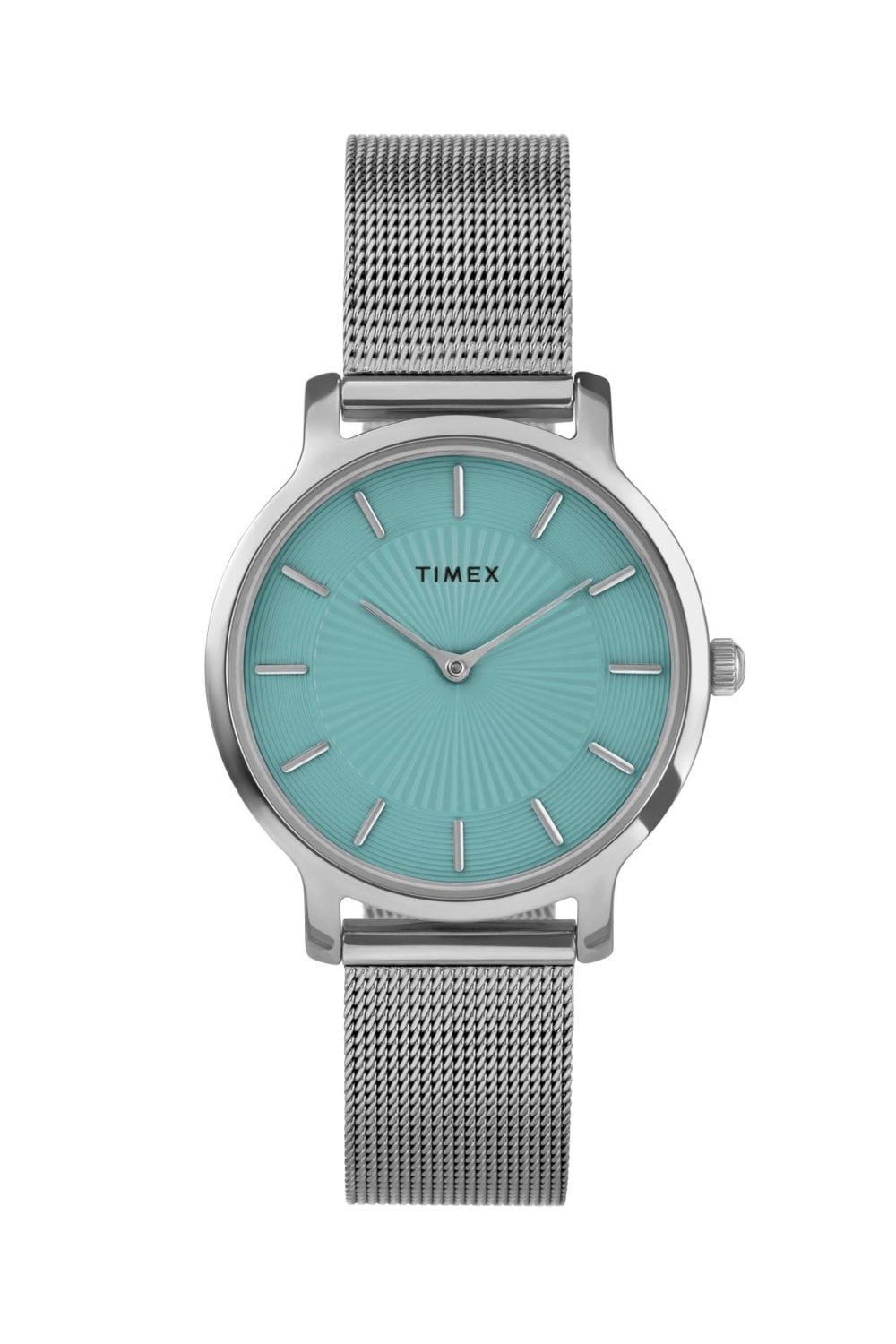 The Timex Ladies Transcend features a stunning analogue turquoise face in a 34mm diameter, 7mm thick case. It's features include a push/pull crown, mineral glass and water-resistantancy up to 30 metres.