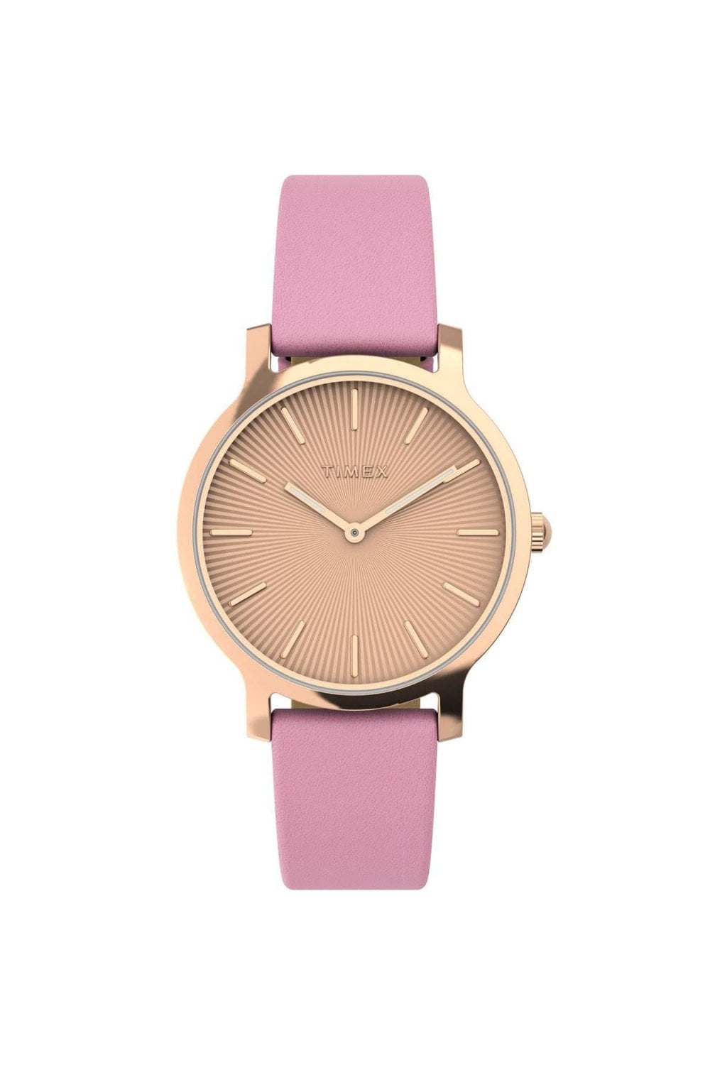 This is a perfect watch for women from Timex. Featuring a stunning analogue rose gold face in a 34mm diameter 7mm thick case. It has all the features you'd come to expect from Timex, including a Mineral Crystal, Push/Pull Crown and Water Resistant. With a standard length leather strap. This watch is water resistant up to 30 metres. It also comes in it's own Gift Box making it the perfect present. All this with a 2 Years Manufacturers (International) warranty for extra peace of mind. Timex offer a beautiful collection of watches for men and women with useful features and the quality you come to expect from Timex.