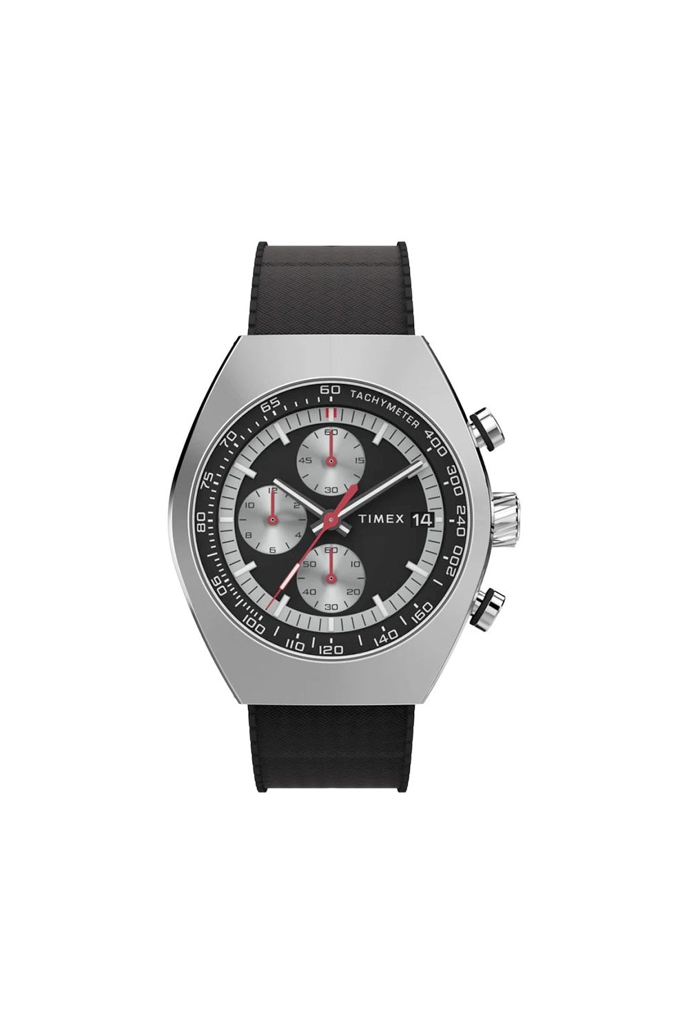 Designed to be visually striking, our Timex Legacy Tonneau Chronograph draws inspiration from the iconic watch styles of the ‘70s. Its sizable 42mm barrel-shaped stainless-steel case houses an elaborate, multi-layered dial with a date window beside the 3 o’clock mark. Sunburst brushing on the top of the case and intricate detailing on the case, crown, and pushers bring this polished timepiece even more sophistication, while bright red hands and a black synthetic rubber strap give it a sportier edge.