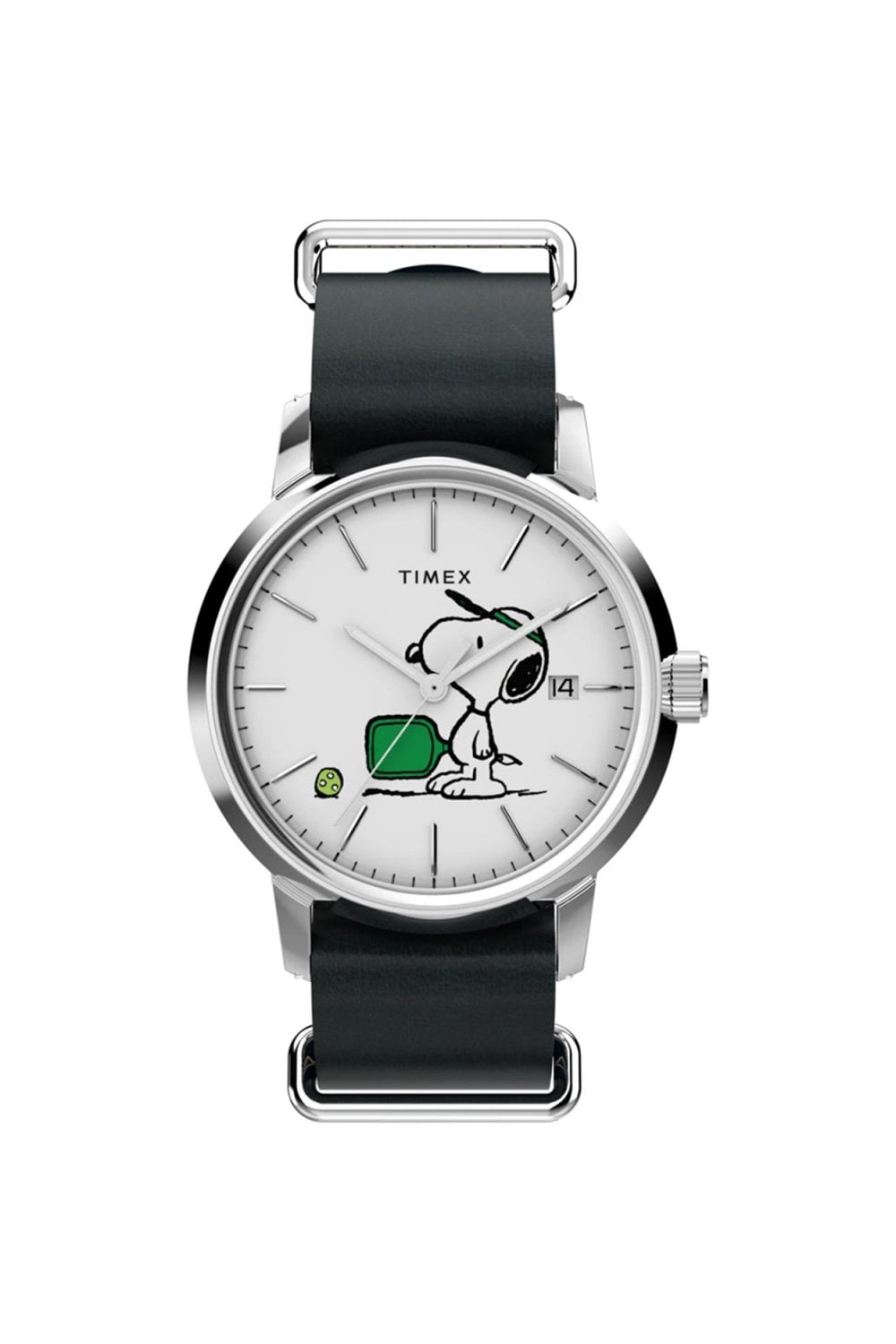Game, set, match! Snoopy and Woodstock team up for a doubles match on the dial of this special edition Timex Marlin. Set against a crisp, minimalist white dial, the duo brings a playful sporting spirit to the classic Marlin silhouette. This 38mm timepiece stays true to its mid-century roots with a stainless steel case and a vintage-style domed crystal, but it’s powered by a reliable modern quartz movement for grab-and-go precision. Finished with a premium black leather strap, it’s a sophisticated way to show off your love for the "beautiful game" of tennis and the world’s most iconic comic duo.