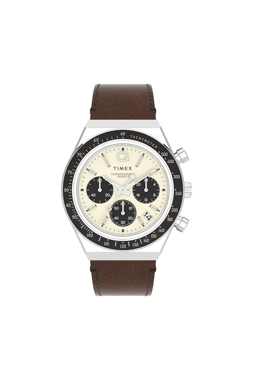 Roar across the finish line with our high-performing Q Timex Chronograph. Inspired by the original motoring watches that graced the tracks of Europe’s most iconic races, this timepiece celebrates the endurance of our legendary 1970s Q Timex. An ultra-precise chronograph movement and black tachymeter bezel recreate the finesse and function of a true racing watch, allowing you to determine elapsed time and average speed like the greatest daredevils in motorsports. Contrasting sub-dials, a date feature, hand-applied dimensional indices, and an updated Q Timex logo smolder against a jet-black dial, while a brushed and polished stainless-steel case and crown bring dynamism and durability to its retro construction. Infinitely wearable, a black leather strap with quick-release spring bars makes for a sporty presentation that’s ready to hit the road whenever you are
