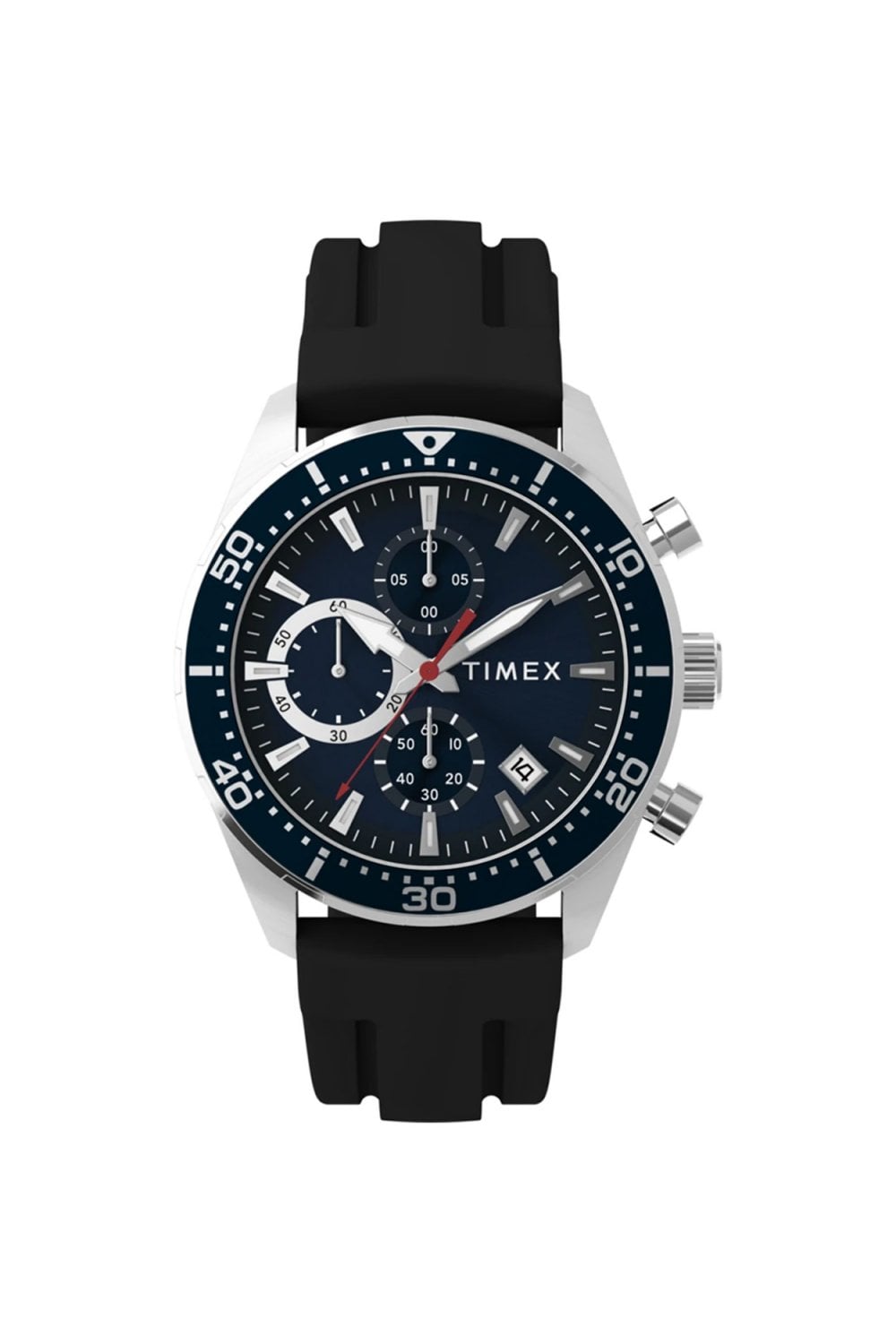From its sporty 42mm case to vibrant red second hand and handy date window tucked between 4 and 5 o’clock, every element of this men's chronograph is crafted to catch the eye and keep pace with your day. Notches on the stationary bezel give the case a diver-style edge, highlighted by polished pushers and a blue sunray dial bringing just the right amount of shine. We’ve paired it with a black silicone strap that perfectly complements its athletic profile.