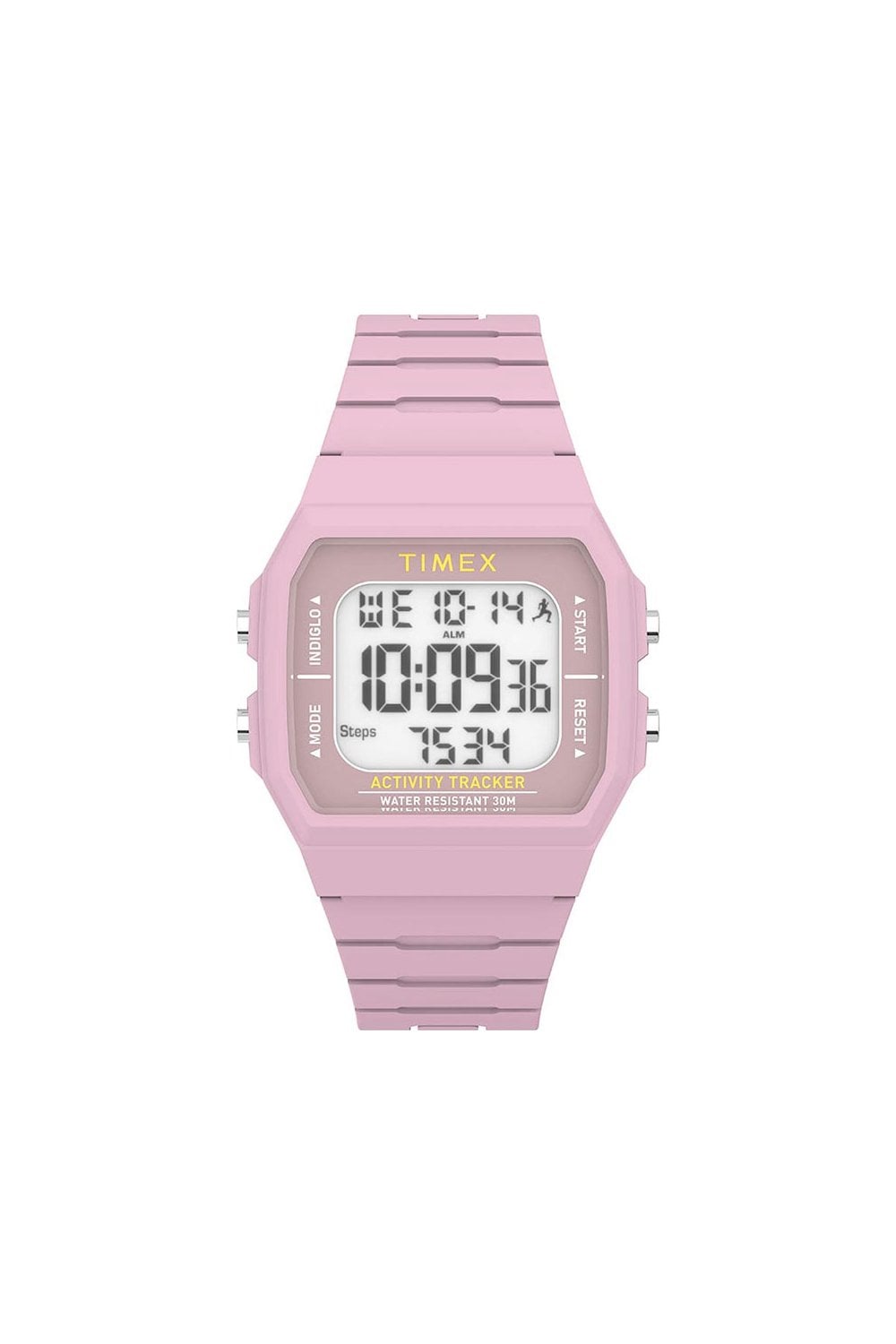 Timex Watch TW5M55800 comes with a pink silicone strap. Features include Alarm, Backlight, Step Activity Tracker, Day and Date Indicator.