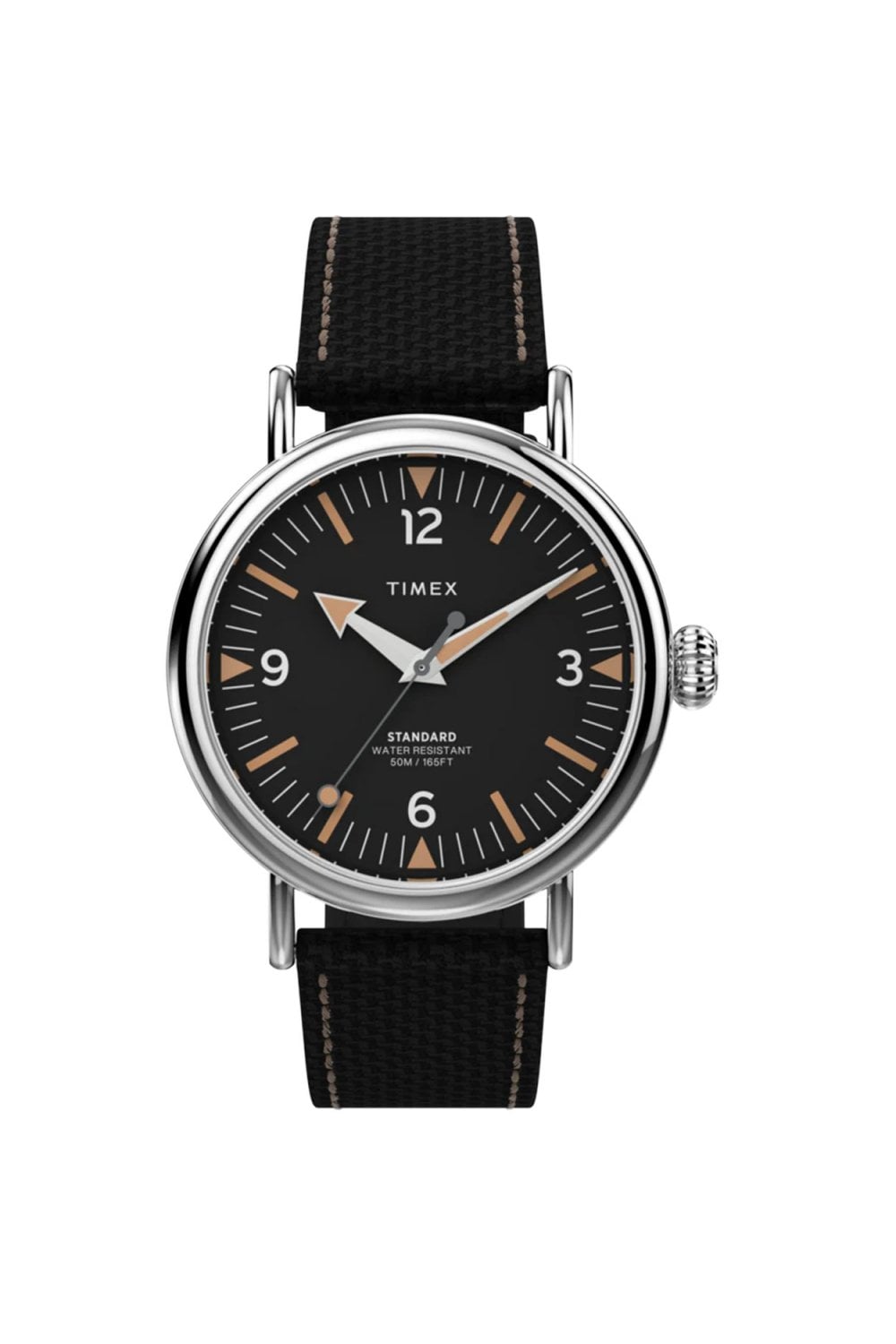 The careful attention to detail of our Timex Standard collection allows these watches to shine as some of our most refined everyday timepieces. This sophisticated update to our Standard 3-Hand brings together classic elements with modern materials that emphasize a military-inspired look—from the unique shape of the hands to a black emboldened and embellished, partial Arabic dial—courtesy of our very own archives. The hour markers are carefully set against smaller minute markers on the outer ring, while an easily interchangeable black leather and woven fabric strap complements the understated, ultra-slim case. The Standard 3-Hand hints at history once more with its traditional, oversized “onion” crown: a nod to our early 1900s pocket watch.
