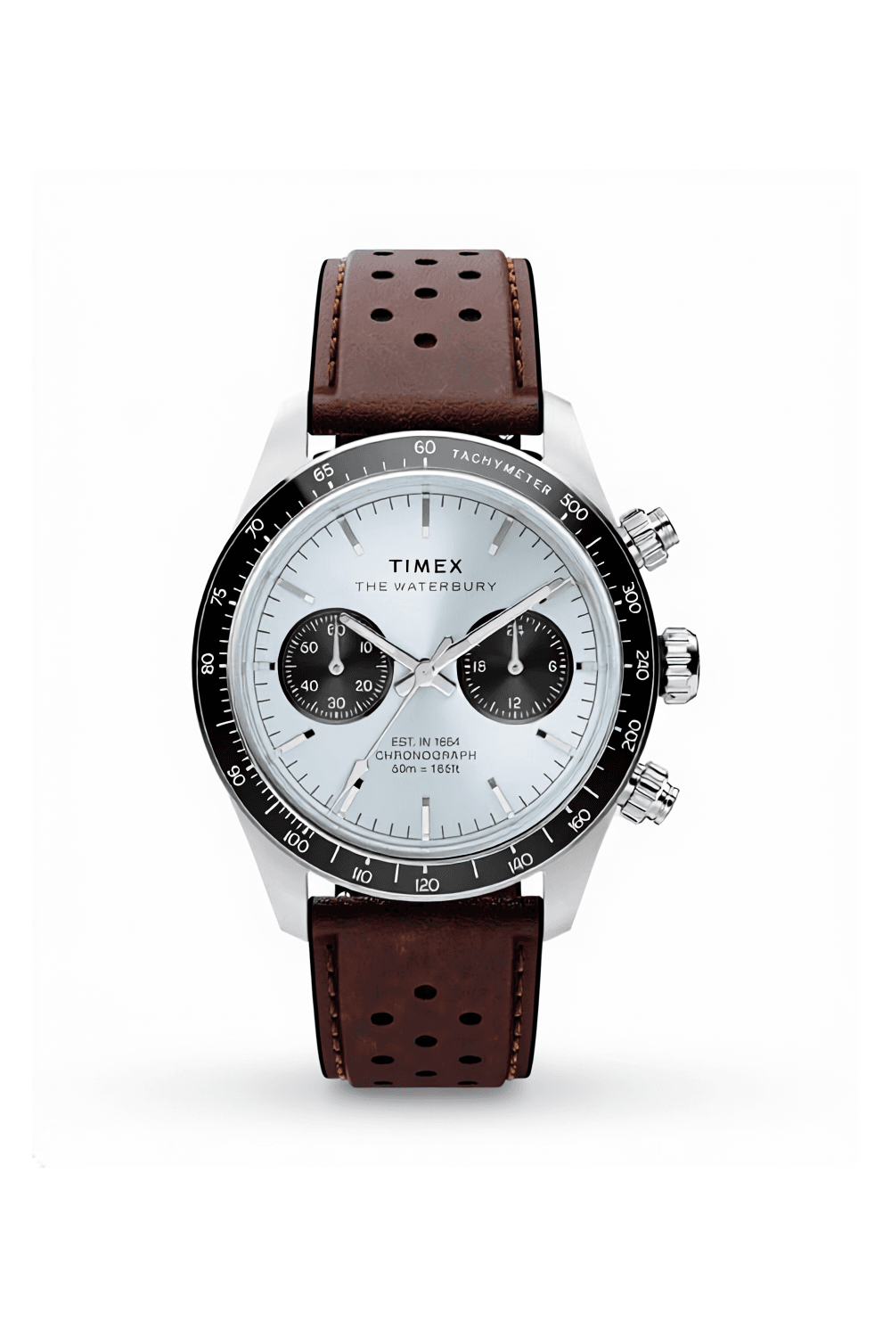 The Waterbury Heritage Chronograph combines modern functionality with timeless design, featuring a chronograph to track elapsed time and a black tachymeter bezel for determining average speed. Encased in a robust 39mm stainless-steel case with vertical brushing, the ice blue dial is accented by contrasting sub-dials and safeguarded by a domed K1 anti-reflective mineral glass crystal. Luminant hands ensure enhanced visibility, while applied indices and intricate detailing on the crown and pushers add a refined touch. Versatility is key, with a brown natural leather strap that’s perforated for breathability and equipped with quick-release spring bars for effortless strap changes, no tools required.