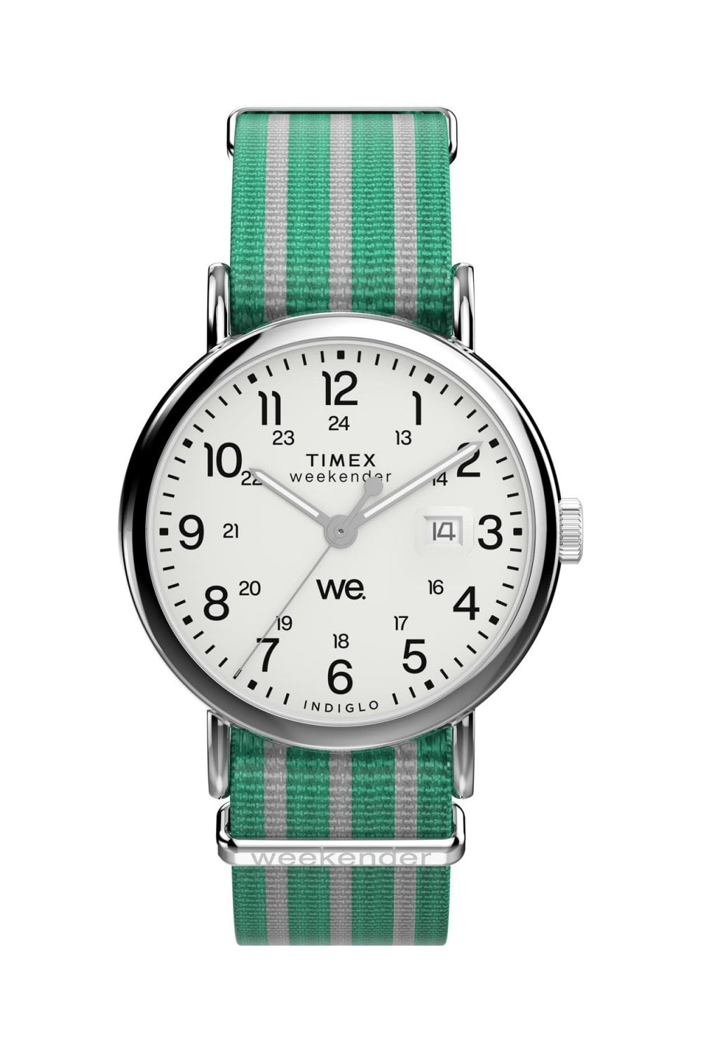 It’s equipped with luminous hands and our INDIGLO backlight, and on the white dial, you’ll find a date window complete with a magnifier for enhanced viewing, both 12 and 24-hour time indexes, and the iconic “we.” logo of the Timex Weekender as a reminder that any boring old day can become unforgettable if it’s spent with our favorite people.