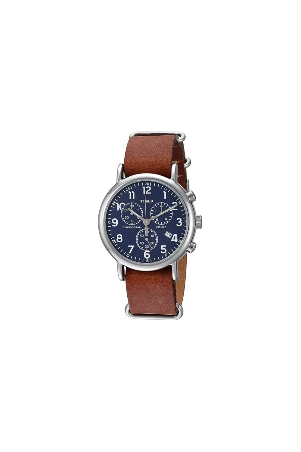 The TW2R63200 Weekender Chronograph watch from Timex. The TW2R63200 features a stunning analogue navy blue face in a 40mm diameter 9mm thick case. The Timex TW2R63200 features include indiglo backlight, chronograph, date window, push/pull crown and water-resistant. The TW2R63200 has a standard-length leather strap. This watch is water resistant up to 30 metres. The TW2R63200 also comes in its own Timex gift box making it the perfect present.