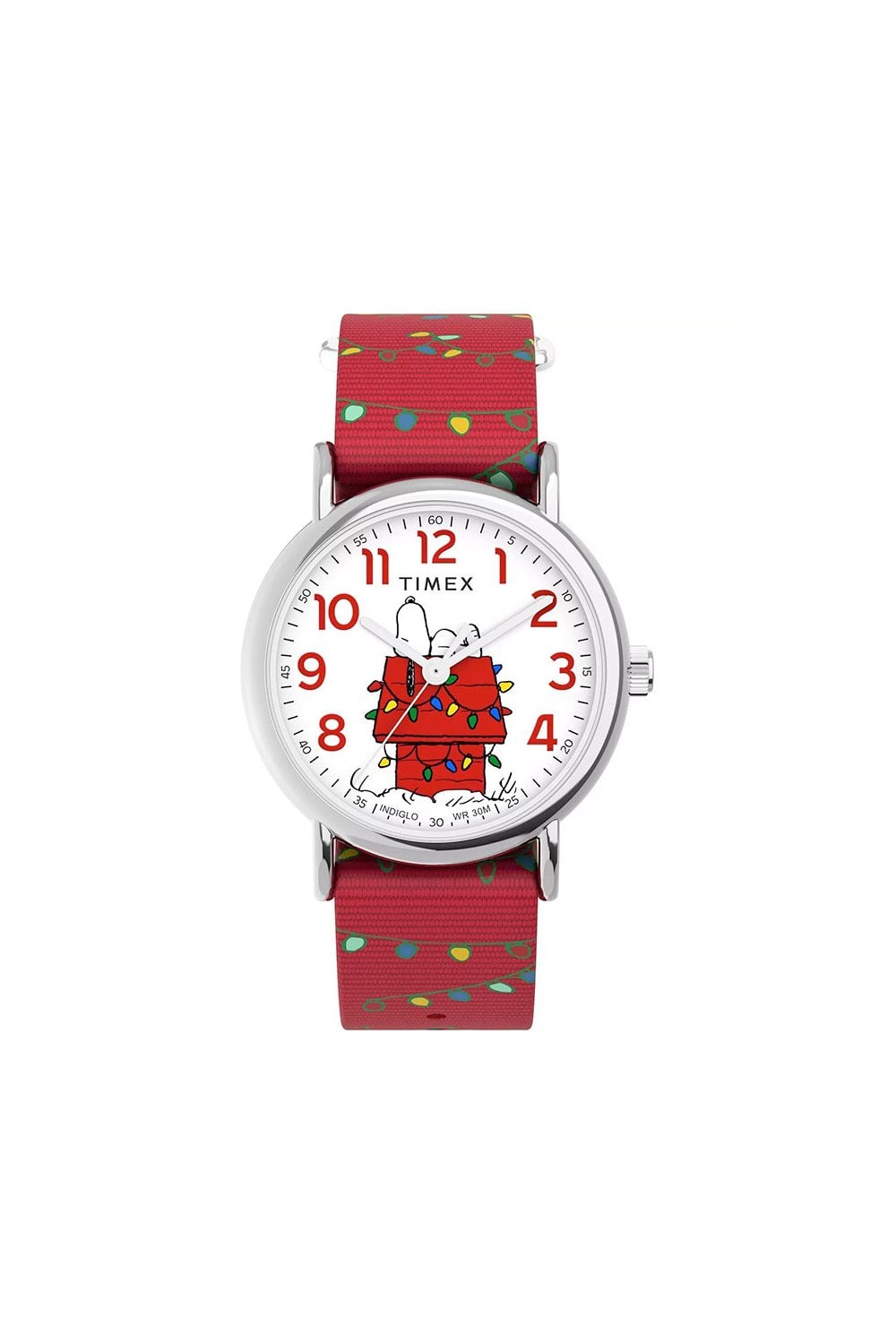 Bring the abundant beauty of nature to your look with our Timex Weekender x Peanuts collection. The red slip-thru fabric strap is adorned with crisp christmas graphics, while Snoopy lies on a chimney on the white dial. Complete with a silver-tone case and INDIGLO backlight, each is perfect for bringing a graceful touch to your everyday style. Plus, it perfectly complements our smaller 34mm Timex Color Rush x Peanuts watch, making it easy to coordinate an adorable look with your little one.